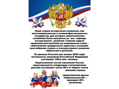 - Наша страна исторически сложилась как многонациональное и поликонфессиональное государство, для которого межэтнические отношения были актуальны во все периоды исторического развития. Главная задача национальной политики на современном этапе – обеспечение гражданского единства в условиях многообразия страны и этнокультурного развития общностей и регионов. По данным Росстата (на начало 2024 года) численность населения Российской Федерации составляет 146,5 млн. человек. Национальный состав населения России характеризуется следующим соотношением: русские составляют около 80% от общего числа жителей страны; представители других национальностей — примерно 20% населения. Среди многочисленных этнических групп, проживающих в России, выделяются: татары, чеченцы, башкиры, чуваши, аварцы, армяне, украинцы, даргинцы, казахи. Кроме перечисленных народов, на территории Российской Федерации проживают и многие другие этнические группы, что делает страну многонациональным государством с богатым культурным наследием. В работе библиотек надо руководствоваться законодательством РФ. В частности, Указом Президента Российской Федерации от 11.07.2025 № 474 «Об утверждении основ государственной языковой политики Российской Федерации».